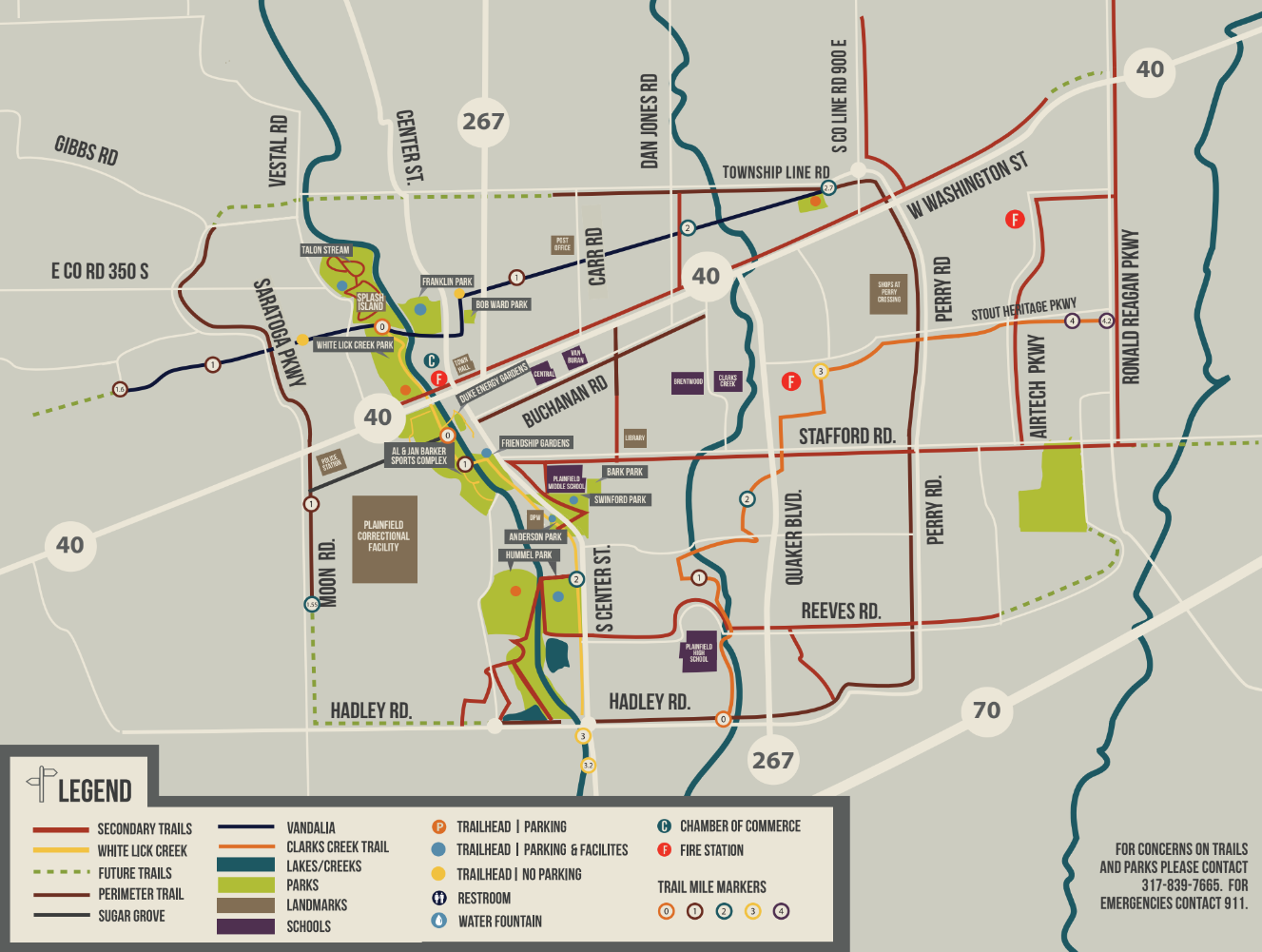Plainfield is known for having one of the most extensive trail networks in Hendricks County, with more than 20–35 miles of paved trails connecting parks, neighborhoods, schools, and local amenities throughout the town. The system is designed so residents can bike, run, or walk between parks and neighborhoods while enjoying green spaces along White Lick Creek, making it one of the features that many people love most about living in Plainfield.